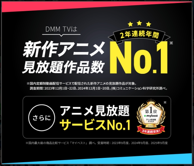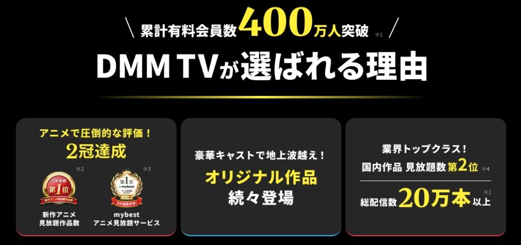 | 注目ポイント | 新作アニメ見放題作品数 No.1 ※2025年7月時点 国内作品見放題数 第2位 ※GEM Partners調べ(国内の映画・ドラマ・アニメの合計話数/2024年10月調べ) アニメ・エンタメ作品に特化 トライアルでもDDMポイント550円分貰える ⇒他のDMM.comサービスでも利用可 アニメ作品を見るならコスパ最強(※2025年12月時点) |