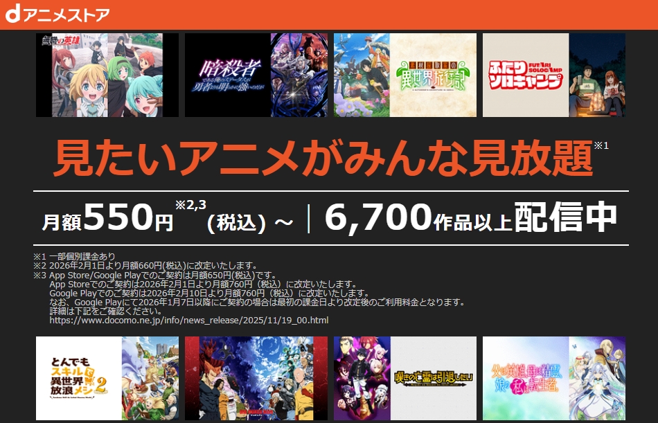 - 月額550円でアニメ6,200作品以上が見放題 ※2025年7月時点