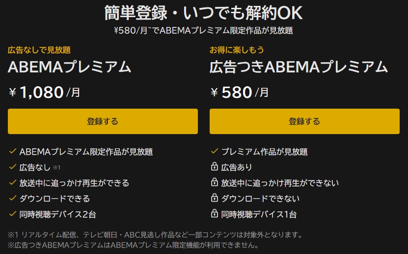 有料版のABEMAプレミアムに加入すると、見逃し視聴や追っかけ再生が使えるようになります。広告付きなら580円。広告無しで見放題なら1,080円。