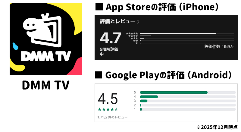 実際にDMM TVを利用されている方の、Google Play、App Storeにアップされている口コミをまとめてみました!